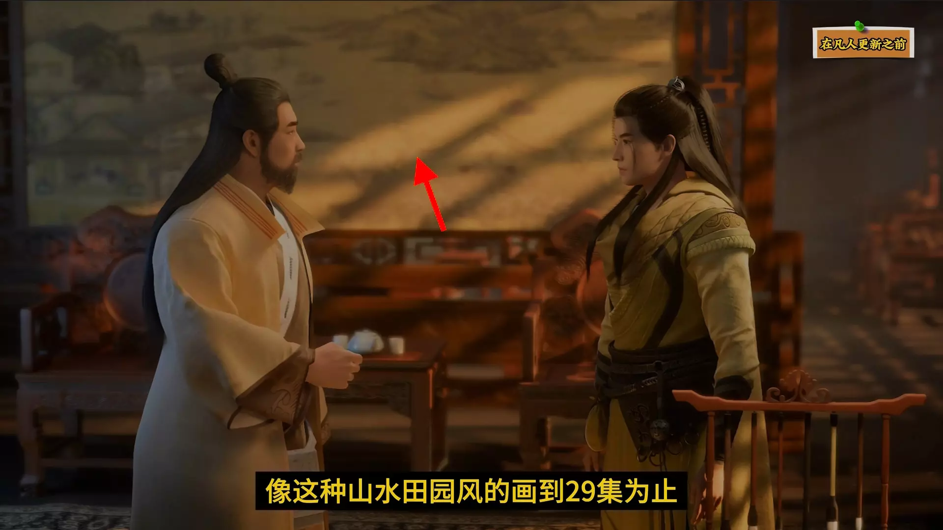 这组图片对比呈现了《凡人修仙传》里的细节,上方是水墨风格的师徒场景,下方是3D建模的对应场景,都展现了长辈教导阴儿、炫儿的情节,体现了作品不同视觉呈现的细节设计。