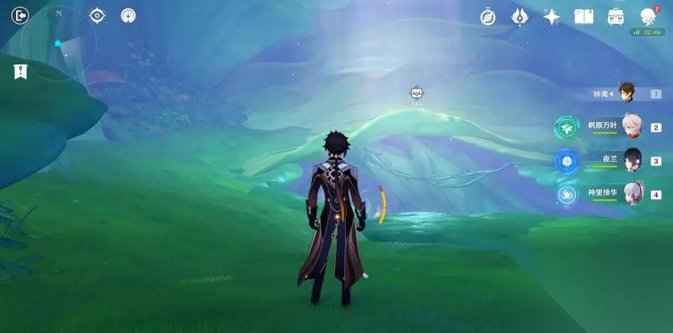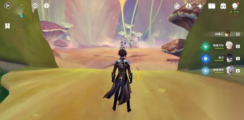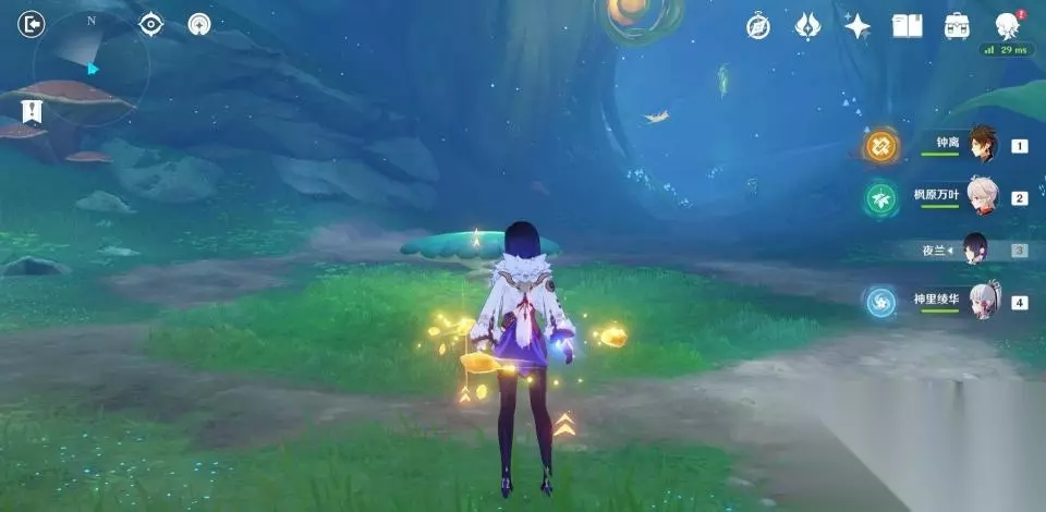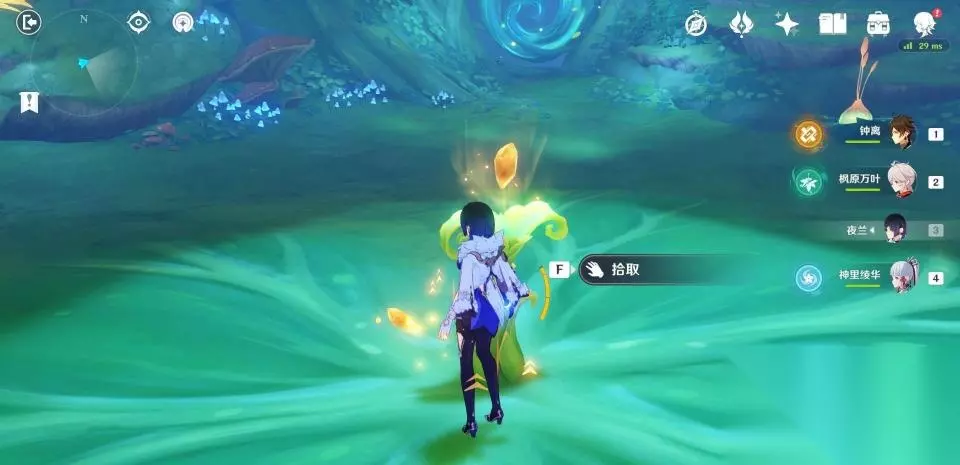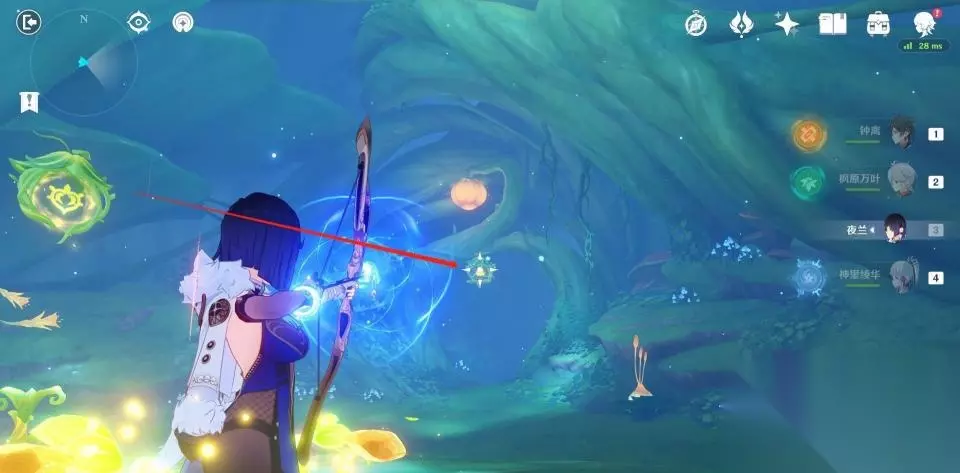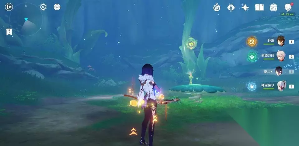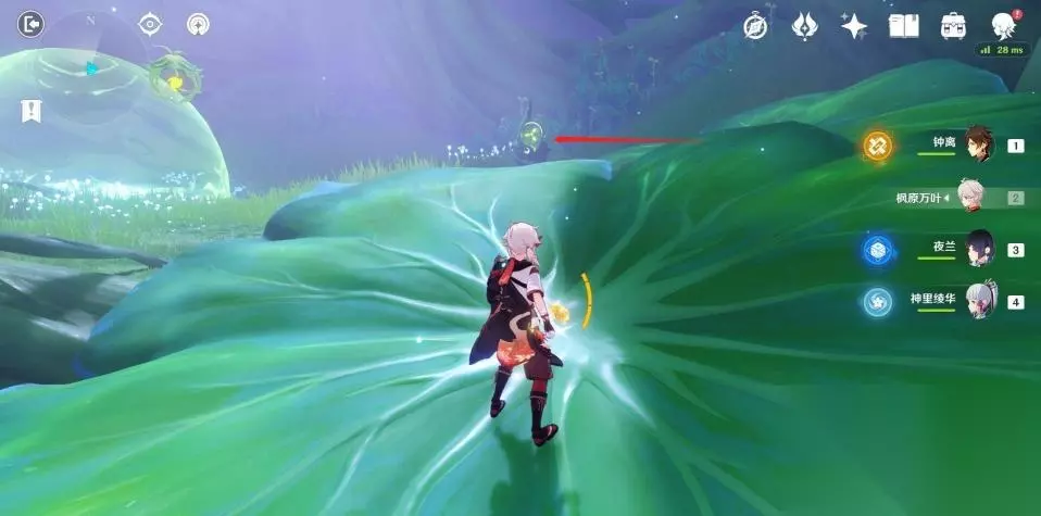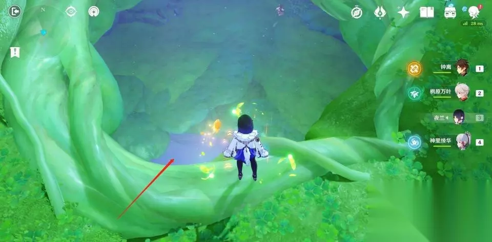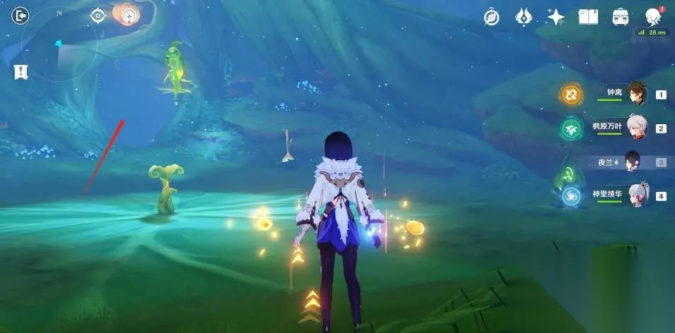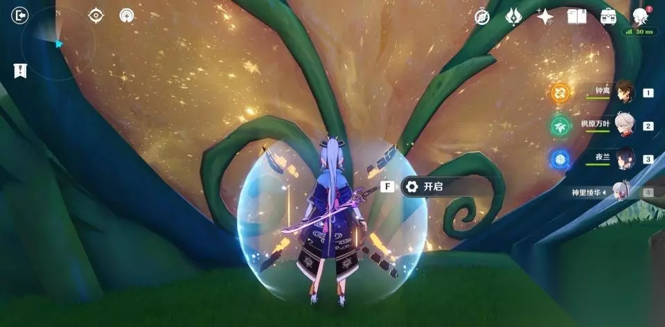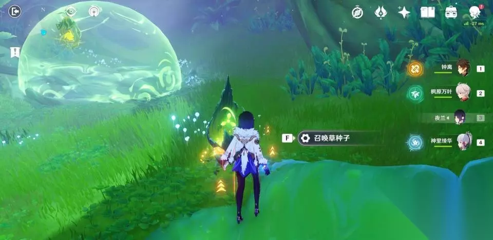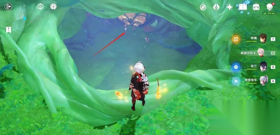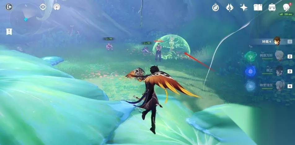 使用弹弹菇跳到秘境第二层后向后方转动视角,可以看到一群敌人在守护着一个绿色的护罩。