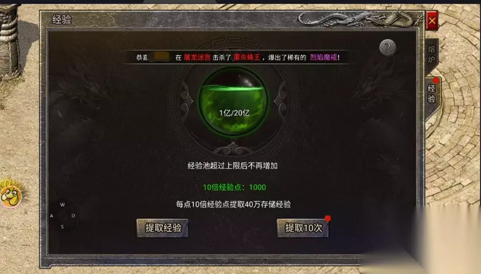 熔炉: 熔炉分为2个,分别是经验、熔炉。 经验熔炉:当角色没有10倍经验时可以将击杀怪物获得的经验储存起来,在玩家使用10倍经验卷后再提取,将经验提升利用最大化。