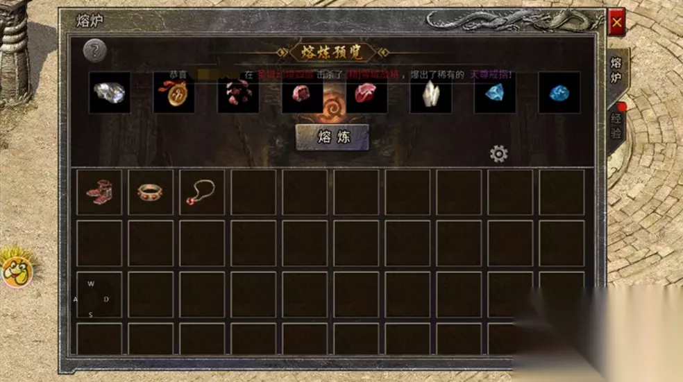 熔炉: 装备通过熔炼获得材料。雷霆级以上装备熔炼后可以获得勋章碎片、1转凭证碎片、转生凭证、黑铁矿石,多余技能书有概率获得技能结晶、创造宝石等高级材料。