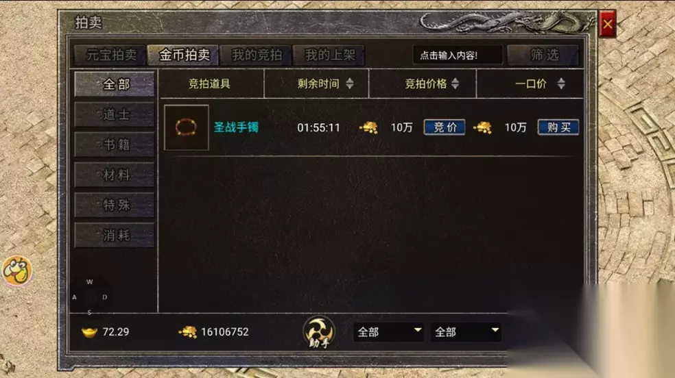 金币拍卖:上架与竞拍的拍品都是以金币进行交易的,由于金币的获取途径较为容易,因此上架的拍品稀有度一般。