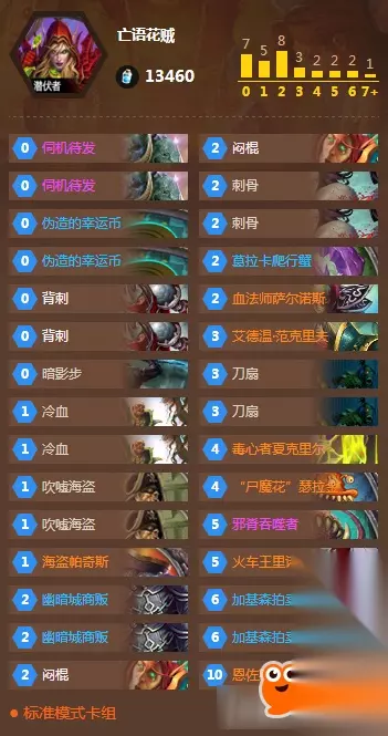 幽暗城商贩:亡语版吹嘘海盗,不稳定拿一张卡,一张职业卡坏处是范围太大,并且随机,不稳定,好处是有惊喜,并且不会受到对面固定套路的影响,比如鱼人套路不至于偷到鱼人,并且死亡可以加强恩佐斯的一波。