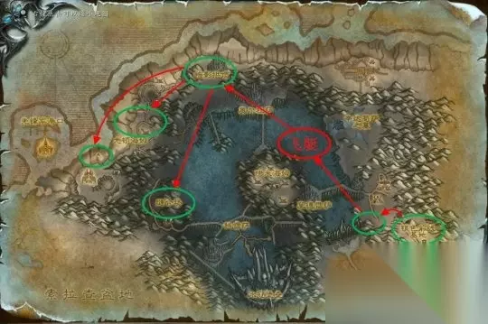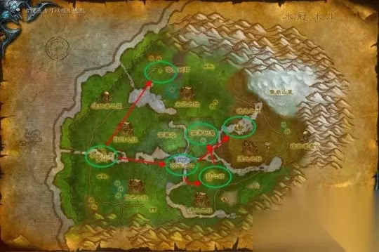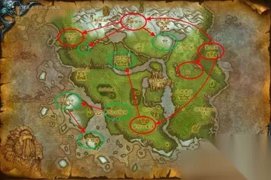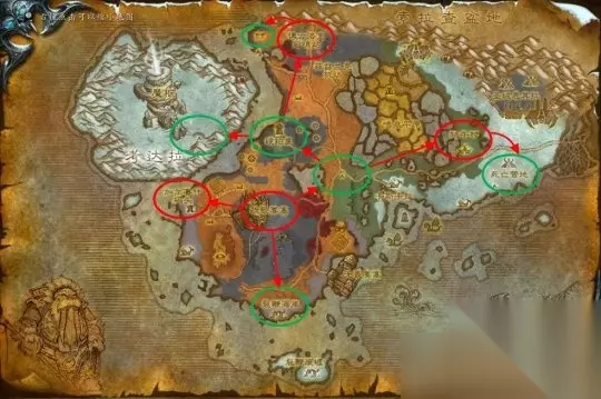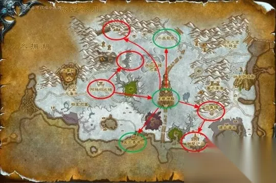 登陆诺森德后可以找旅店老板多购买一些面包和水,它们会比法师制作的魔法食物拥有更高的恢复速度,在你的升级过程中提供了不小的便利。 北风苔原 任务等级:68-71 副本等级:魔枢68-73、魔环78-80 如果选择北风苔原作为诺森德的第一站,不要忘了在战歌要塞提升自己的专业技能上限哦。 我们会从战歌要塞开始,而后会接到前往加尔鲁什码头、裂鞭海岸和仁德会营地的任务,在帮助了仁德会的朋友后会前往琥珀崖和牦牛村进行任务,之后会让你前往考达拉、博古洛克前哨战、冬鳞避难所等地。最终将来到死亡营地完成萨萨里安的任务链。这期间我们也可以进入位于考达拉的地下城“魔枢”,击杀怪物获得经验。 Tips:如果在北风苔原地图消灭了中立的野兽获得3分钟的“动物的血渍”debuff,仁德会营地的NPC会主动攻击你,只要去任意水域浸泡一下即可消除。 北风苔原任务链 红圈代表部落任务营地,绿圈代表中立任务营地,下同