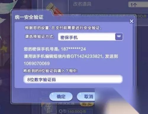 4.若是自己的QQ号开启了QQ安全中心,则在输入框中输入QQ安全中心的动态验证码再点击确定即可。若是没有开启QQ安全中心则通过QQ密保手机编辑指定短信发送到指定号码中获取验证码,输入验证码之后点击确定即可购买。