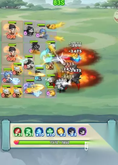 2、角色选配: 开局后羿,哪咤,雷震子(下面简称:三大主力)尽量不要扔,保证快速合到6级,或者两个5级。前期输入够的情况下金币少用,待格子刷出来后根据填满情况而定。 3、格子空间利用: 三大主力除外,尽量上场格费少等级高的角色,不得已的情况下其他角色丢掉。 4、阵容搭配: 怪物会先打第一排,两个角放置蟾蜍,中间隔一段距离放两个低级后羿,这样会把怪物拉四个回合,让怪物在死在路上。第一排打完后才会打第二第三排。 5、技能选配: 优先三大主力的紫色技能,再三大主力的蓝色技能,经验和减速各一半。最后绿色技能优先攻速再攻击,二者都出优先攻速。后羿的落日破军必选,后期打小怪用的到。 6、50关瓶颈: 根据以上思路开局搭配,50关过了以后,就可以躺了,阵容不要变,把场上能升级的升级一下。后羿多多宜善。