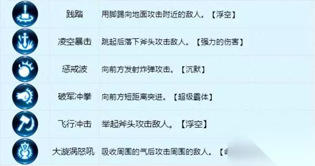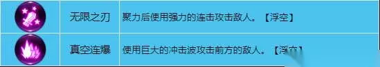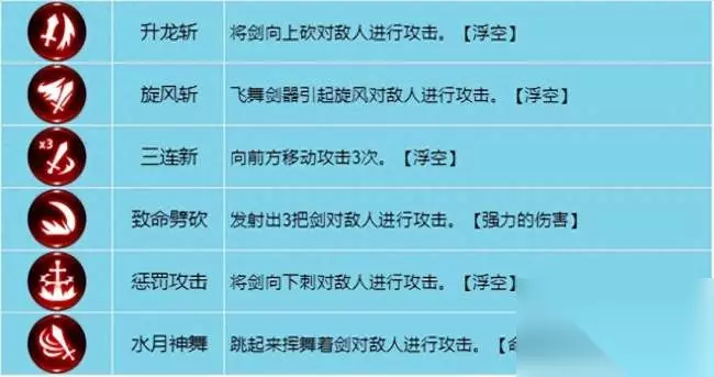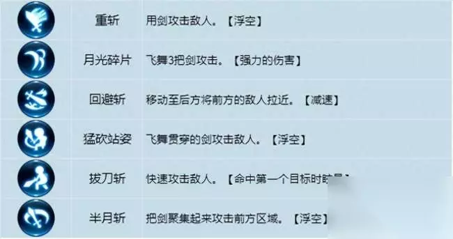 武器技能 主动技:角色战斗时主要使用的技能,标识为蓝色。 连续技:标识为红色,玩家发动攻击、受到攻击都能积攒怒气值,怒气值提升至上限则会进入斗志状态,斗志状态下,使用主动技后10秒内能使用连续技。 3、终极技:伤害高、冷却长的强力技能,主副武器的终结技共用冷却时间,标识为紫色。 长剑主动技