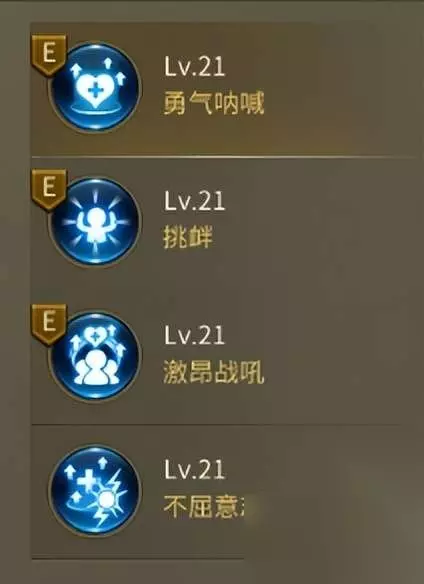 防守 勇气呐喊:持续时间内增加自身生命上限。 挑衅:持续时间内对范围内的敌人挑拨。 激昂战吼:持续时间内增加自身及周围队友的生命上限。 不屈意志:解除自己的异常状态,持续性的恢复生命。