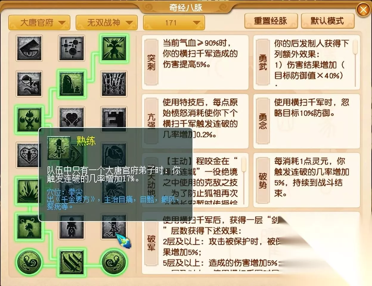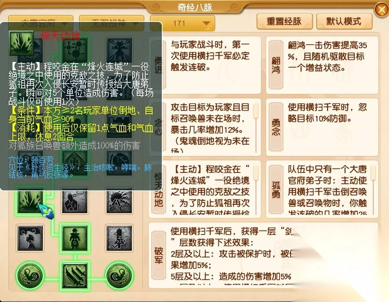 常规PK来看,很少有三扫大唐会选择这个经脉,一方面是跟“不惊”经脉在同一层,另外就是不能选择“熟练”经脉。(熟练:队伍中只有一个大唐官府弟子时,你触发连破的概率增加17%) 大唐在PK中选择“惊天动地”经脉也不是没办法用出大招,毕竟天元组有谛听,倒地两个人的情况经常出现。高速宠拉起大唐,化生寺活血,宝宝卡一个大金,用出惊天动地。这种理想情况是存在的,但对手不会给太多机会,使用起来还是很难。