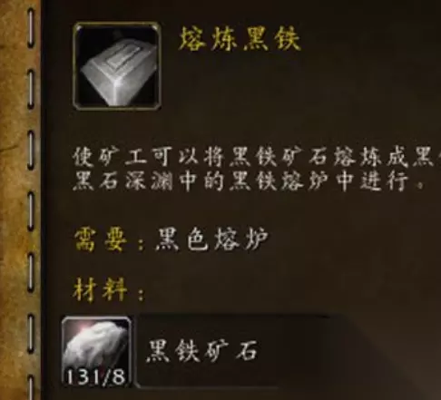 魔兽世界怀旧服黑铁矿石怎么熔炼 熔炼黑铁锭的学习方法: 在黑石深渊七贤大厅学(右手第2个NPC学)。 需要带材料:20金锭10真银2红宝石;需要黑石深渊钥匙(任务)开机关,关键过黑石酒吧那里,问酒吧老板普拉格买6瓶黑铁啤酒给NPC或者完成魅魔NPC的任务。 熔炼黑铁锭:在黑石深渊里MC入口附近,有一个火元素守卫的熔炉。