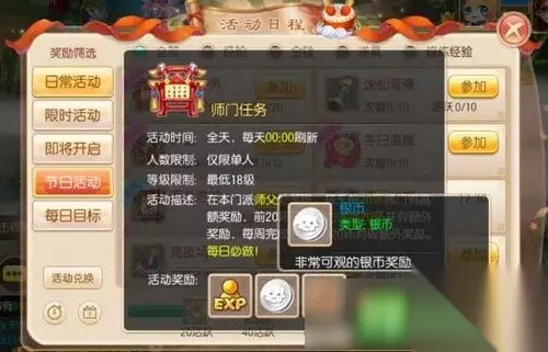 赚取银币 银币是干嘛的,兜妹身上经常揣着几百万银币,然后莫名其妙跑个环、修下装备、点点修炼就变穷光蛋了......如果你也有同感,那就往下看吧! 1.日常任务 大多数日常活动在完成时都会给予银币作为奖励,镇妖、赏月、师门、护送任务、节日任务(平定海波),这些都是高收益活动,想过上小康的生活,这些可是必做的哟!