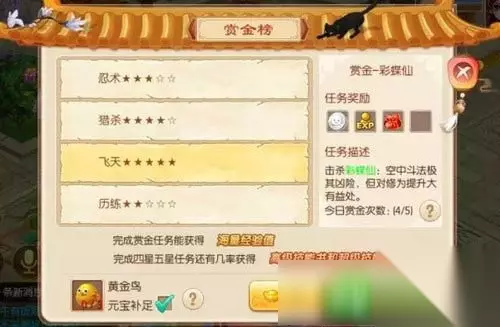 在选择PK对手时,尽量选比自己级别低、段位低的,建议带上封和奶,对面都是木头人,只要不是装备碾压,获胜还是比较容易的!(友情提示:辅助职业在竞技场优势较大,兜妹从来都是选择输出职业去挑战的) 4.妖兽突袭 每天两只,有几率获得3、4级宠物装备和超级技能书~不过是有前提的,你要打的过!打不过的童鞋,可以点 这里 哟~ 5.赏金猎人 赏金这个任务大家需要知道的技巧就是巧妙运用手中的黄金鸟,因为5星的赏金任务是必给高级/超级书的,所以存一些黄金鸟,可以找一天人品爆发的时候大赚一笔~