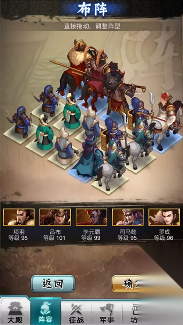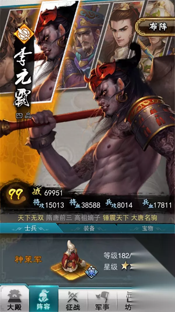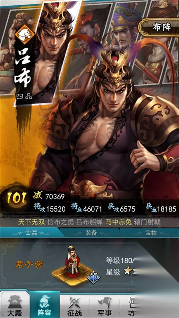 不仅如此,游戏中的诸多将领还分别拥有各自的属性,包括技能属性和战法属性,有的偏攻击,有的偏防御;士兵也有步、弓、骑、策等多种分类和专属属性。因此,怎样搭配武将和士兵使其发挥出最大战斗力考验着玩家的智慧。
