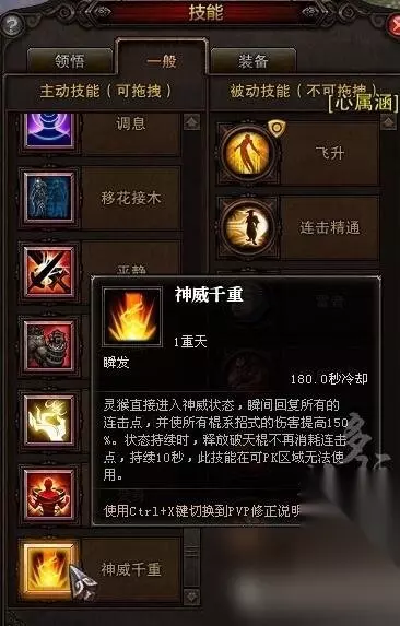 加强灵猴PVE强度,加入新技能【神威千重】,一般分页内60级后自动学会。 【神威千重】 灵猴直接进入神威状态,瞬间回复所有的连击点,并使所有棍系招式的伤害提高150%。状态持续时,释放破天棍不再消耗连击点,持续10秒,此技能在可PK区域无法使用,3分钟冷却。 灵猴加强后手法的改变 豆(10)定二操逼开始 护身+巨猿+神行(-3)+活筋(+3)+隐身,甩两个破天上定四,乱舞剩3豆,打三个破天马上开神威豆全满,无消耗打到乱舞状态完,这样神威时间差不多剩6秒,解除定四打多四个破天再进定四,神威时间差不多完,又触发乱舞8秒(豆是满的)狂撸到一豆不剩。 这个手法大胆在于乱舞后马上点掉定四状态,在神威不耗豆的状态下再打出下一个乱舞,达到持续爆发的效果。 这个手法如果成立的话将是猴子最大爆发的输出手法。没攻速的平民最少也能打出23个破天,而且buff的覆盖也不会有一点浪费,buff状态下几乎全在打破天。 这套手法的提升空间也很大,一个破天我是按一秒来算的,随着攻速提升能打出更多的破天,特别是打四个破天进入第二次乱舞后神威时间是还没完的,攻速快的绝对能多打几个。23个是最保守的估计了。 当然如果这手法可行的话最重要的问题就是站住脚的问题了,护身可以把CD满了。BOSS关键攻击没护身适当闪避应该还是能站住的,没测试过的都属想法。 这个手法用来单刷是最好的,如果你能小套带走boss话基本可以无视这手法。可以选择在状态全满的时候就开神威,这样短时间的攻击力是最大的,但是也浪费了多余的豆,所以组队抢伤果断选后者,单刷一套带不走的就用这手法解决了猴子爆发后无力的尴尬。最大程度利用剩余的豆豆,一点都不浪费。比你打两个小爆发输出要来的多。