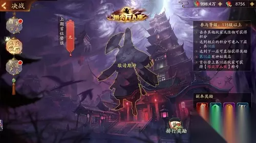 玩家角色升到115级可参与九层妖塔玩法,参与时间为每日20点00分至20点25分,奖励经验值,魂器精华、铭纹宝箱。玩法入口:主界面-决战-九层妖塔。