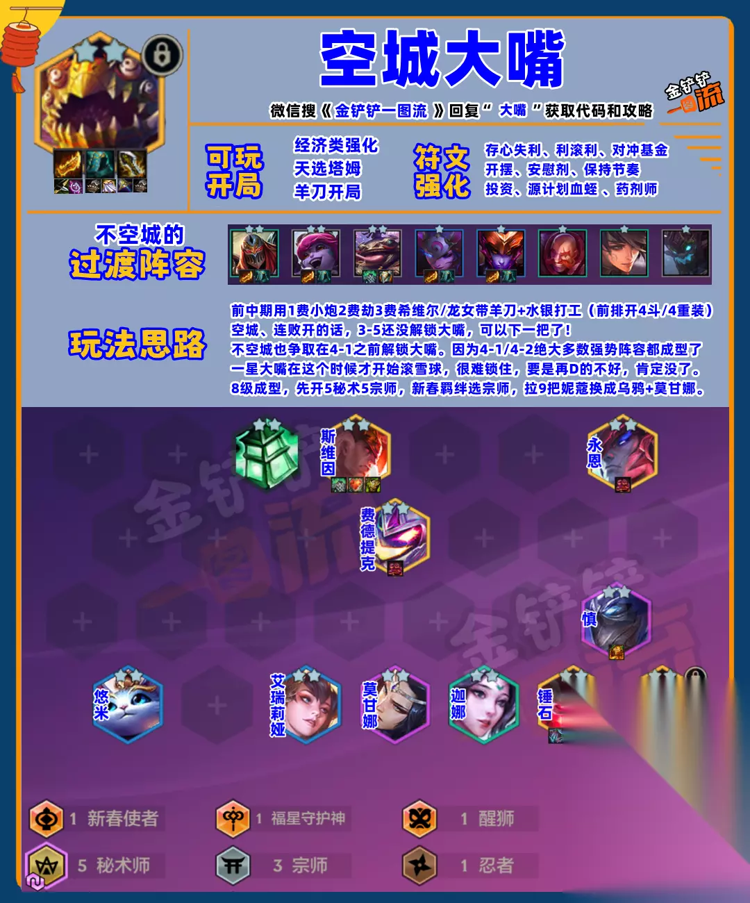 8级成型,先开5秘术5宗师,新春羁绊选宗师,拉9后再把妮蔻换成乌鸦+莫甘娜,秘术天选,就不要妮蔻。最后,空城宗秘大嘴一图流奉上: