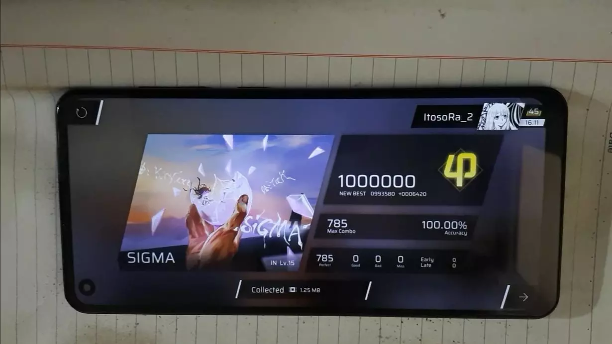 这是一篇关于音乐游戏的帖子,作者表达了对Phigros与maimai进行联动,加入特定曲子的期待,同时展示了Phigros的游戏游玩画面,呈现了该音游的游玩场景。