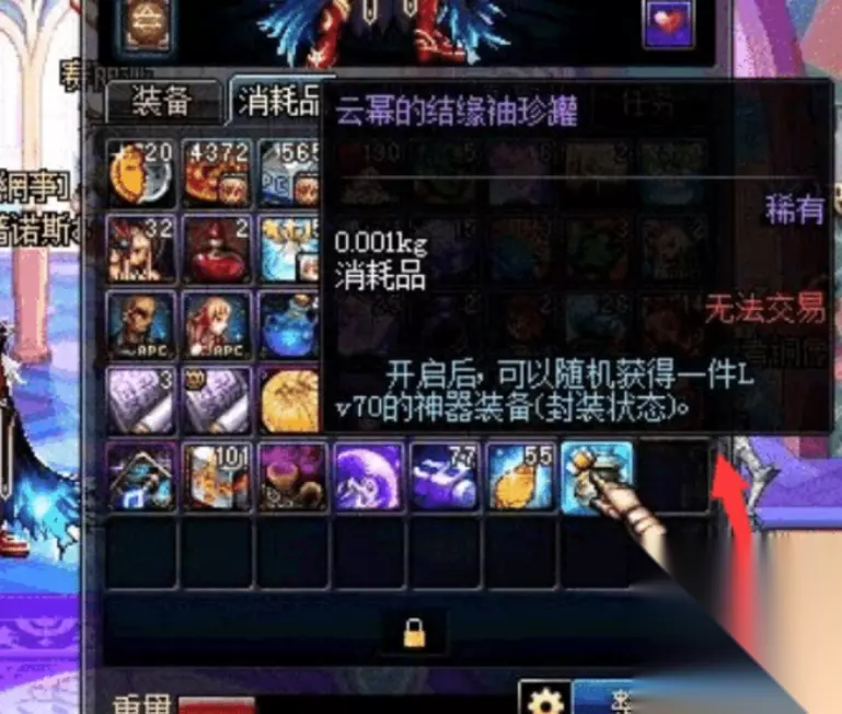 云幂除了卖一些极品装备之外,还有各种的罐子和道具,其中这个云幂的结缘袖珍罐最为特殊了。这个罐子可以说是地下城史上最难得到的罐子,刷五千次图才有资格买,价格高达两亿。这个罐子直接花钱是买不到的,要想获得这个罐子必须得要用1600个云幂的结缘石兑换,每一次只能在云幂那里买到一块结缘石。 而当年大家平均刷三次图才能遇到一次云幂,也就是说大家需要刷五千次图才有可能集齐1600个结缘石。并且这个结缘石还不便宜啊,一个就要九万金币,这缘分也太贵重了吧。也就是说这就需要花费近两亿金币买这些结缘石才能兑换到这个罐子,这代价也太高了点吧。