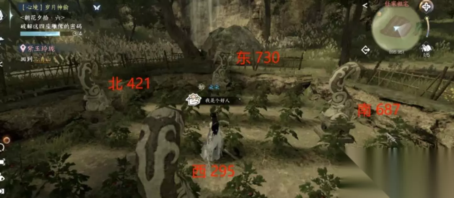 3、清点遗物顺序:3,1,3,2,2,3; 4、药物归类:红色-止血散,黄色-金创药,绿色-安神丸,蓝色-养心丹; 5、解锁箱子密码:6-5-1; 7、雕像解锁:如下图所示东730,南687,西295,北421,转动使它们全部面向中心。