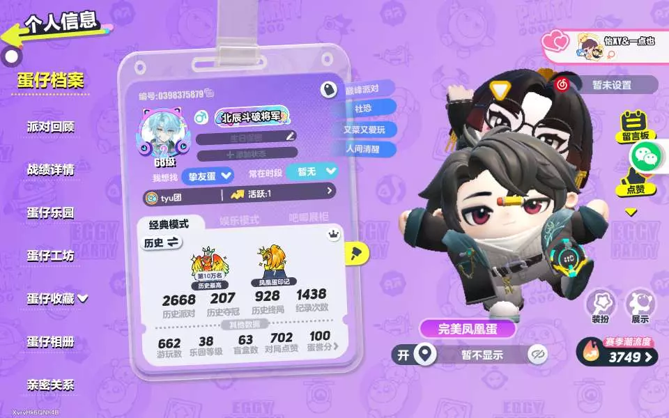 在我的眼中是一款竟争游戏和游览一些美景乐园感受游戏之美与乐趣。我最喜欢上分/、玩惊魂夜和一些其他玩法。我想找一些挚友蛋和一些宝宝蛋陪我,若你们没有朋友也可以找我,我什么都玩,基本都玩。蛋仔名:北辰斗破将军。
