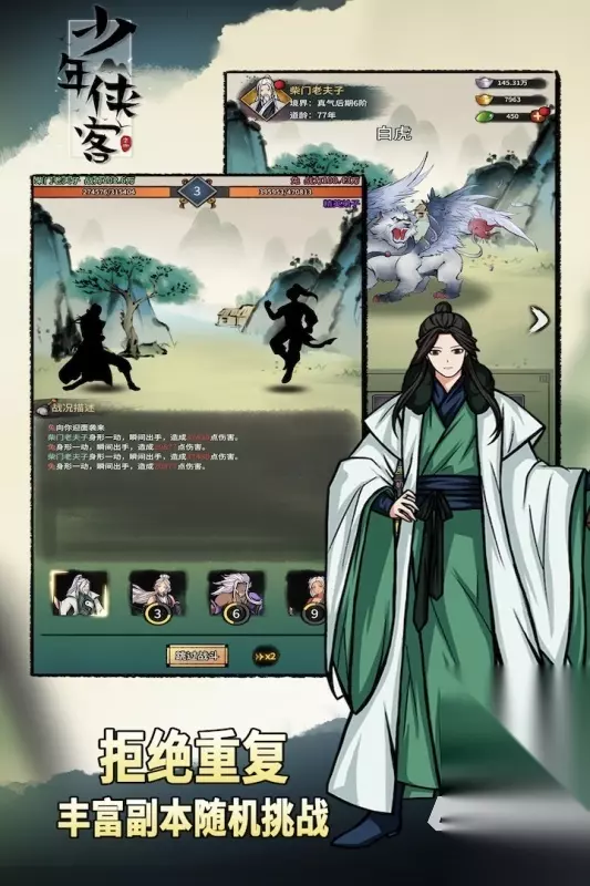 在这款游戏中有着比较纯正的玩法,游戏中的各种画面主要采用的是文字修仙的形式。所以各种内容都是比较直截了当的展示出来的,而且大家可以获取到四种不同的货币。大家可以通过系统招募的形式来进行技能的组合,而且游戏中的画面也是非常的大气,大家可以任意的来穿梭感受传统神话的魅力。 高速下载 普通下载 5、《少年侠客手游版01》