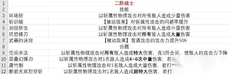 战士技能分享 在本次demo中有一些职业会开放给玩家,就比如说战士这个职业。这个职业的技能是:黄金猛攻、幸运道具、道具行家等等。 环场斩:以斩属性物理攻击对所有敌人造成少量伤害 斩识破:[被动效果]对斩属性攻击的闪避率提升 加倍斩击:以斩属性物理攻击对所有敌人造成中量伤害 狂怒锋刃:以斩属性物理攻击对所有敌人造成大量伤害 武器的诀窍:[被动效果]普通攻击的攻击力提升50%