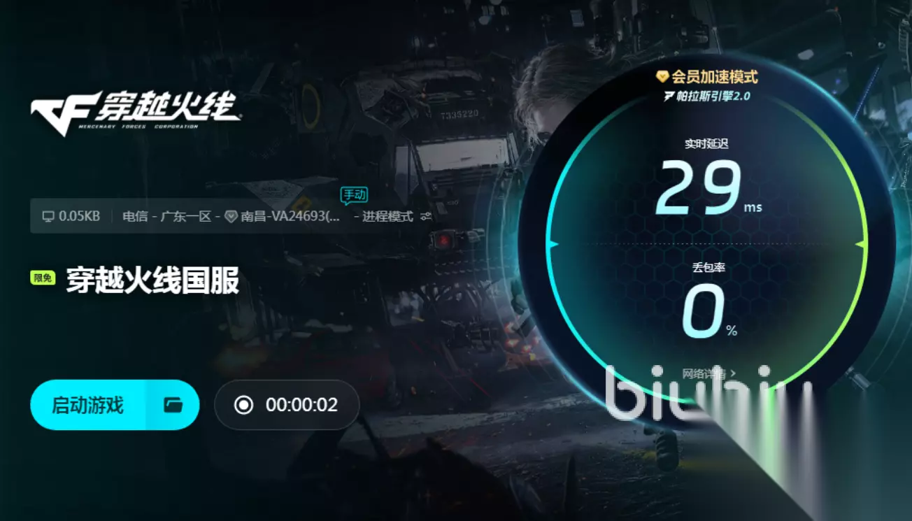 biubiu 的另一个优势在于操作便捷,界面友好。用户只需要下载并打开应用,在首页搜索“穿越火线”点击启动加速,即可快速进入加速通道,无需进行繁琐配置。同时在加速过程中,软件会实时显示你的延迟、波动和丢包率等关键指标,方便你随时判断当前网络是否达到最佳状态。对于不太懂网络原理的普通玩家来说,这种可视化的数据反馈尤为贴心,让网络优化变得更直观、更透明。此外,它也支持PC端与移动端的同步使用,无论是端游还是手游CF玩家,都能享受到稳定服务。