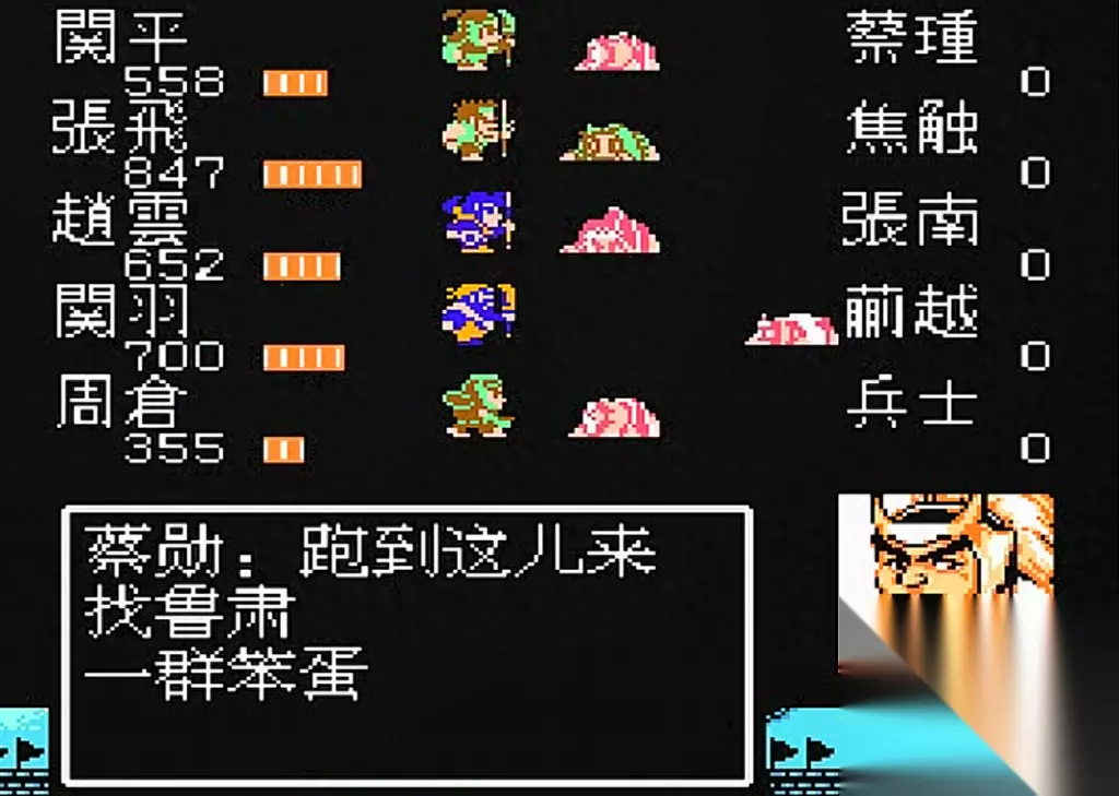 赤壁之战前的准备工作,队中没有刘备,加入了一个临时工鲁肃,因为襄阳能找到铁系武器,鲁肃拿铁剑也没什么优势了,这时队中的核心就是张飞,关羽和赵云其次。