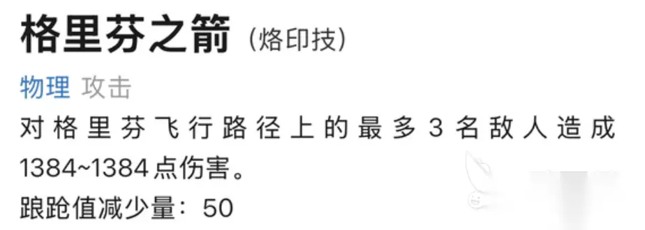 2、格里芬之箭 格里芬之箭为烙印技能,该技能对于格里芬飞行路径上的敌人能够造成1384点伤害,且攻击目标最多能够到达3人,踉跄值会减少50点。
