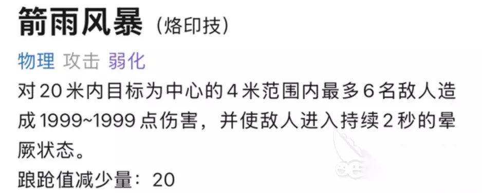3、箭雨风暴 箭雨风暴也是一种物理攻击技能,该技能能够对20米内目标为中心的4米范围内最多6名敌人造成1999点伤害,还能让敌人进入到2秒的晕厥状态,该技能属于弓星的群攻技能,却群攻的效果也是极为不错的,在遇到大量的敌人时,使用这个技能可以一次性的伤害到6个敌人,大大的减少自身的压力。