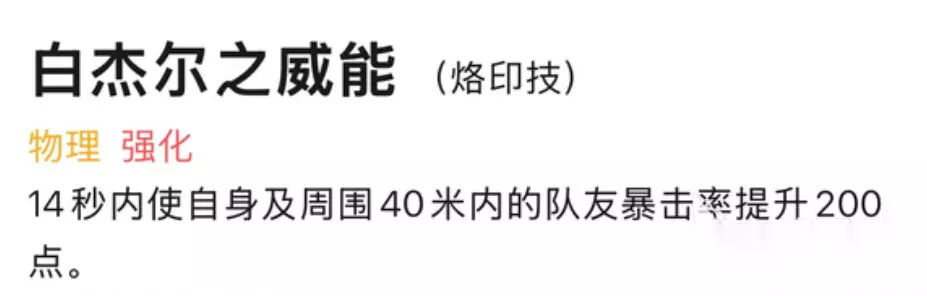 5、白杰尔之威能 白杰尔之威能是一个带有强化效果的物理技能,该技能在使用以后能够爱14秒内使自身以及周围40米内的队友暴击率提高200点,最多能够给4名队友提高暴击率。