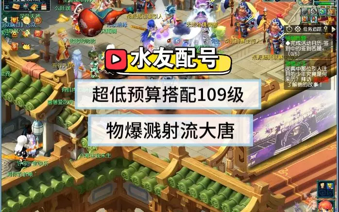 这是《梦幻西游》的水友配号内容,展示了109级物爆溅射流大唐官府角色,该角色暴击可达8000、溅射可达5000,还展示了角色的锦衣、灵饰、装备及经脉等配置,探讨该物理号日常任务是否好组队。