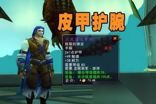 巨龙盟友护腕。49敏捷38耐力,绿字38暴击等级和100点攻击强度,这个皮甲护腕的强度也属于5H的BIS装备,战士、盗贼、猎人、野德和DK都可以用得到。