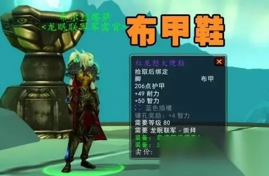 红龙怒火便鞋。白字属性49耐力50智力,绿字提供51点急速和77点法术强度,还有一个蓝色宝石插槽,由于80级的法系输出和治疗属性已经统一,再加上这是个布甲鞋,因此除了法师、术士和牧师通用以外,就连奶骑、奶萨、电萨、奶德、鸟德都用的到,并且在进入团本之前,这个鞋子都属于BIS装备。