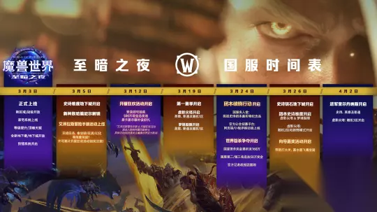 至暗之夜现已全球同步上线! 在“至暗之夜”中,随着艾泽拉斯的世界将陷入凶险的境地,玩家将踏入新三部曲的下一个篇章。先驱萨拉塔斯已然成为我们最大的威胁。她率军直击血精灵的故乡,深入永歌森林的心脏,所到之处一切都陷入了混乱。 “至暗之夜”内容解锁计划 随着“至暗之夜”内容更新的上线,玩家可以体验许多全新内容。以下是在踏出第一步时可以游玩的内容。 最高升至90级 所有重制及全新区域:永歌森林、祖阿曼、哈籁恩达尔和虚影风暴。 世界任务 名望奖励路线 家宅系统与文化节 “至暗之夜”全新地下堡 地下城:普通及英雄难度 狩猎系统:普通难度 哈籁尼尔同盟种族:玩家需要完成哈籁恩达尔区域的升级战役,方可解锁这一全新的可选种族。 请注意,在“至暗之夜”中,地下城的解锁方式将略有不同。当你的第一个角色在各区域进行主线战役时,你会遇到与叙事紧密相关的任务。或者,当角色达到90级时,无论是否完成这些任务,所有地下城都将解锁。寻找并承接各地下城的关联任务,能让有需要的玩家更早进入地下城。 地下城 任务 等级 风行者之塔 风行者之塔:萦绕的旋律 或任意角色达到81级。 密谋小径 密谋小径:一举歼灭 或任意角色达到83级。 迈萨拉洞窟 迈萨拉洞窟:迈萨拉的饥渴 或任意角色达到85级。 夺目谷 夺目谷:光绽根须 或任意角色达到88级。 纳洛拉克的洞穴 纳洛拉克的洞穴:未获宽恕 或任意角色达到88级。 魔导师平台 魔导师平台:落叶归根 或任意角色达到90级。 节点希纳斯 节点希纳斯:月蚀 或任意角色达到90级。 虚空之痕竞技场 虚空之痕竞技场:三人不成行 或任意角色达到90级。 部分特定功能暂不可用,将在3月5日当周每周重置后开放。 3月5日当周重置后开启的内容: 专业技能每周任务 奥术秘社:访客任务 狩猎:困难难度 史诗难度地下城:季前赛(包含全部八个“至暗之夜”地下城。在3月19日之前为每周进度锁定,随后将改为每日锁定。) “至暗之夜”第一赛季将于3月19日开启。 重要版本内容概览 “至暗之夜”战役、升级和区域 所有玩家在上线后,都将接到“至暗之夜”任务,跟随任务指引,前往奎尔萨拉斯,在永歌森林开启全新的冒险旅程!随后,你可以自由选择探索各个全新的区域! 永歌森林:时间长河抚平了这片土地的创伤,就连天灾军团入侵时留下的死亡之痕也已渐渐愈合。然而,死亡与黑暗的领域依旧存在,它们蛰伏在视野之外,被世人遗忘。你的征程将从此开启。