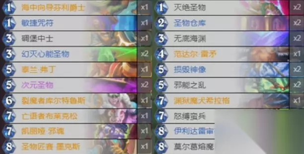 无底海渊卡组玩法介绍: 思路就是用无底海渊上手雷矛减费大哥,然后利用芬利换牌拿到减费的大哥牌,利用大哥牌完成场面上的碾压从而取胜。这里还携带了过牌和圣物体系在之中做一个过渡使用。