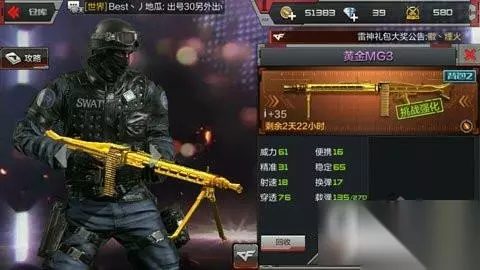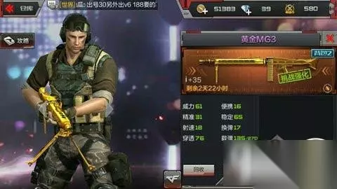 CF手游武器黄金MG3厉害吗?CF手游武器黄金MG3怎么样?这篇有关CF手游黄金MG3武器性能介绍,希望可以帮到小伙伴们。 小编最近弄了一把黄金MG3,纯金材质打造,据说在二战时就有了,很适合用来打挑战和生化模式。小编觉得这是个好东西,应该拿出来给大家看看的,所以小编就来谈谈这把枪。