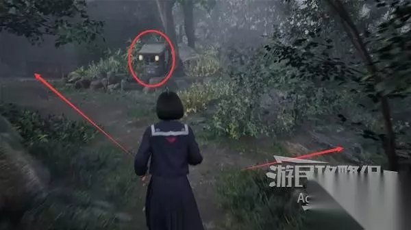 钻过狭缝后,往前走遇到怪物,暂时还无法攻击怪物,只能先躲。 河边搜刮下有红色胶囊。 经过小河,到下图位置钻进去捡到羊羹,可以在神龛卖钱,里面还有个收音机。钻进洞也会暂时甩掉怪物,正好躲一躲。