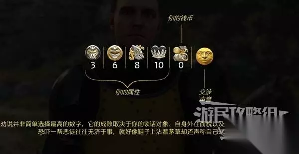 剧情动画后,画面一转来到几周之前,故事紧接着前作,亨利作为汉斯少主的护卫,陪同前去联络皇家总管奥托三世·冯·波尔高,希望他也能站在国王这边。 骑马时可以看到自己的狗狗跟在后面跑,遇到卫兵队长托马斯,对话时需要进行说服。 很多时候都可以通过说服NPC来解决问题,你的各种说服能力的属性值会对结果产生影响。 但要注意劝说并非简单选择属性数字最高的选项,它的成败取决于你的谈话对象、自身外在面貌以及声誉好坏。例如,仅凭武力恐吓一帮恶徒往往无济于事,就好像衣着褴褛却还声称自己是个贵族一样。