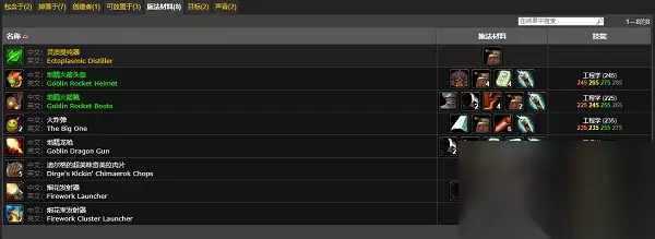灵质提纯器 材料:地精火箭燃油 地精火箭头盔 材料:地精施工头盔、地精火箭燃油x4、秘银锭x4、不牢固的扳机 地精火箭靴 材料:黑色魔纹之靴、秘银管x2、重皮x4、地精火箭燃油x2、不牢固的扳机 大炸弹 材料:秘银外壳、地精火箭燃油、实心炸弹x6、不牢固的扳机 中文:地精龙枪 材料:秘银管、地精火箭燃油x4、秘银锭x6、真银锭x6、不牢固的扳机 迪尔格的超美味奇美拉肉片 材料:地精火箭燃油、石中盐、奇美洛克的腰肋肉 烟花发射器 材料:秘银管、地精火箭燃油、不牢固的扳机、秘银外壳 中文:烟花束发射器 材料:秘银外壳、地精火箭燃油