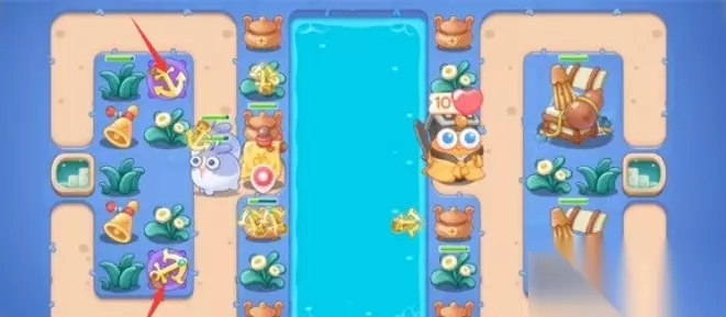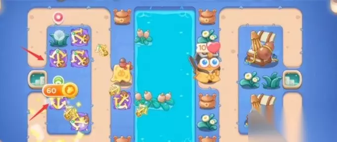 《保卫萝卜4》阿波道长第23关满星攻略 1、开局如图所示位置放置两个船锚,并将船锚升至2级,利用船锚的分裂攻击可以更高效率的清理附近的障碍物。