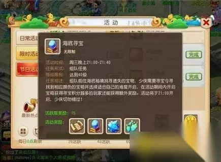 6、海底寻宝活动除了奖励经验、银两外,还有机会获得魔兽要诀、五宝、宝石和法宝碎片等丰厚奖励;每次活动积分前10的队伍,都可以获得“宝藏猎人”的称谓和额外奖励。快叫上小伙伴们一起前往海底秘境寻宝吧。海量宝物等着你!
