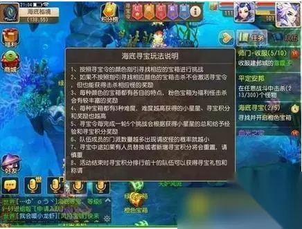 4、到了周三晚21:00-21:40,小伙伴们就可以组队前往海底秘境寻找遗失的宝物啦。根据屏幕上方的寻宝令寻找到对应颜色的宝箱并选择适合自己的难度开启,按顺序击杀掉一轮宝箱后,会根据获得小星星的总和给予经验和寻宝积分奖励哦。