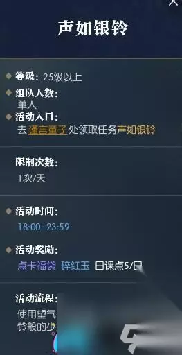 逆水寒手游声如银铃怎么做 谨言童子位置:汴京(640,615) 每天都会有新的任务发布,每天18:00-23:59可以完成任务。