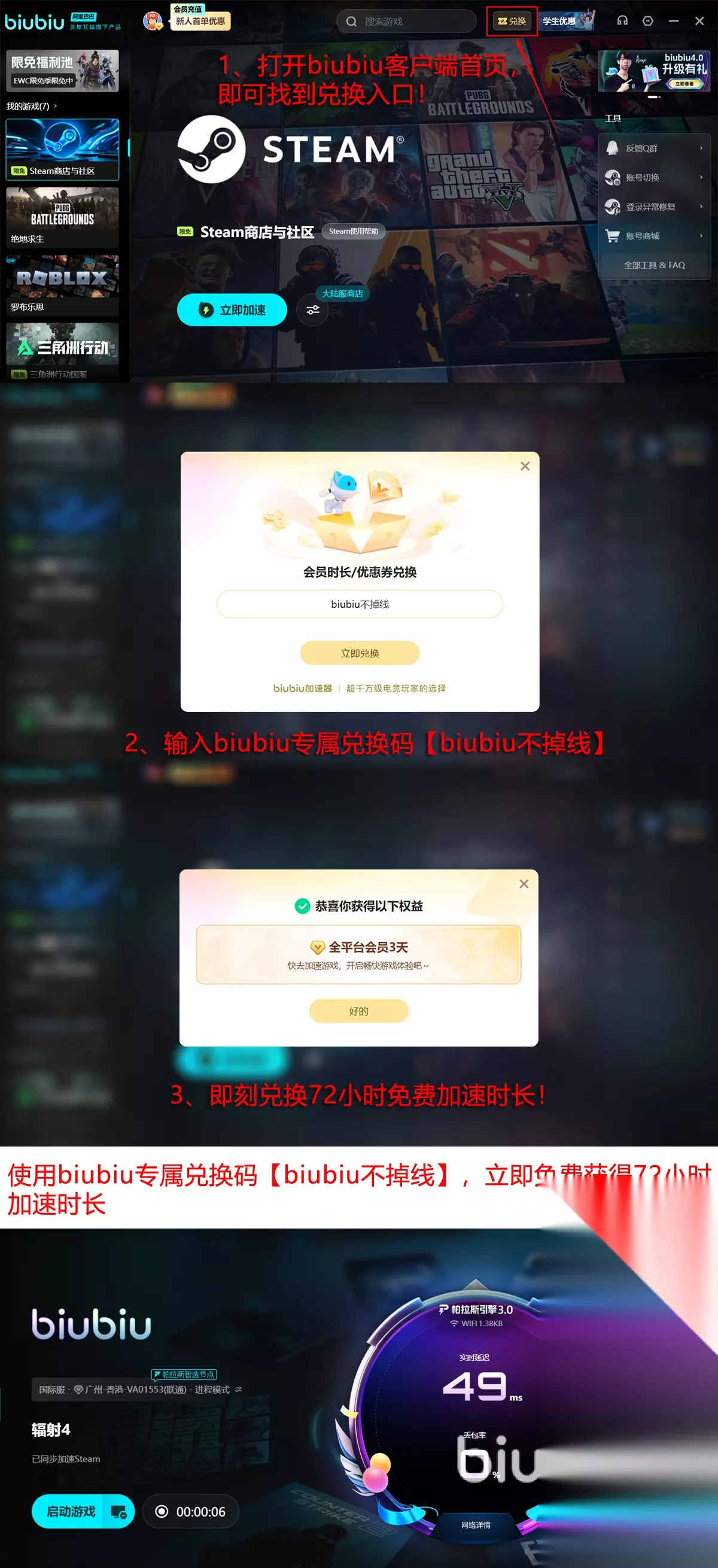 优质服务现在给大伙免费用的机会在呢,抓住福利领取才好,来到此的新人可以领取24h免费服务时间的,其余优惠也在等待领取中,用【biubiu不掉线】会再换到额外的72h时间用,一共新人可用96h的。biubiu的限免加速库为了庆祝冬促的到来,在12月18日到1月18日这段时间里,开放多项服务,买到游戏就能来找,而且steam平台也享受该服务的。