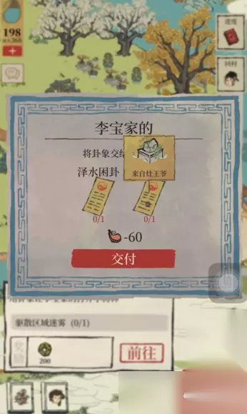 获得卦纸后,玩家需要找到站在桥头附近的NPC李宝家的(描述为一位病弱的女性角色),并将卦纸交给她。此举可以驱散地图上阻挡道路的迷雾。迷雾消散后,沿着道路过桥,便能在颜料店正前方的一片小树林中找到铲子,通常只需点击即可拾取。需部分任务流程建议优先完成去沈家仓库找钥匙等任务来辅助驱散迷雾,其根本目的仍是打通前往小树林的路径。