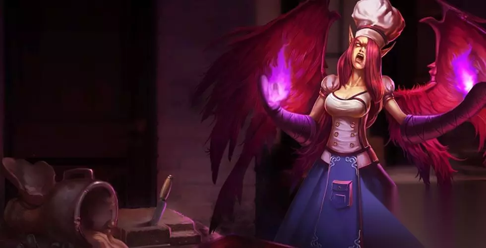 地狱厨房——莫甘娜 普通皮肤,国服已下架,不过可通过开活动箱子及武器大师商店获取! 模型可能发生很大改变,不过主题不变,和塔姆、阿卡丽、潘森、加里奥、奥拉夫等同属食物主题皮肤; 有可能增加特效↓