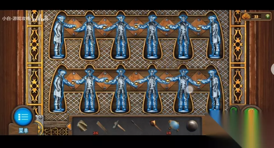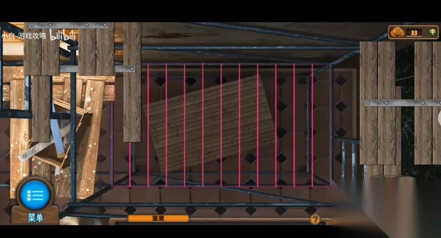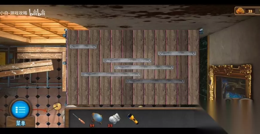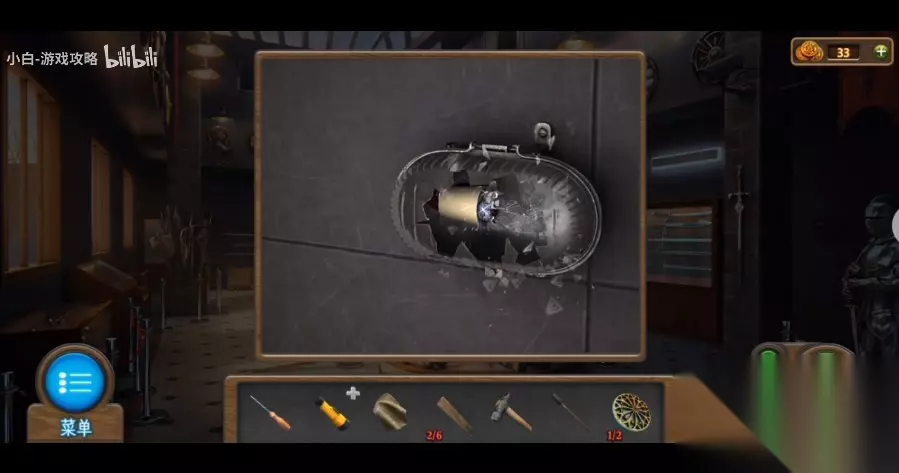 144、将炸药添充在大炮中,应用拉杆将炸药推进去,再将火炮放到大炮中,应用拉杆将火炮也推进去。 145、查看物品栏里的【拉杆】,应用【面料】包裹住【拉杆】的头部,再将【油剂】撒到【面料】上,得到【火把】。 146、应用【锤头】将右侧墙壁上的应急灯砸碎,再换【火把】在火苗处引燃,最终应用【燃烧火把】引燃大炮。 147、进到博物馆最里面房间,捡取门左侧【木板】和靠在右侧展柜里的【木板】和地上的【头部1】。 148、对左侧架子上挂着的红色衣服拉链应用【油剂】开启拉锁,得到【锁匙】。 149、加木板安置在左前方的架子上,进行游戏(游戏难度不高,只需将木板铺详细即可),应用【螺丝刀】开启最上面的通风孔。