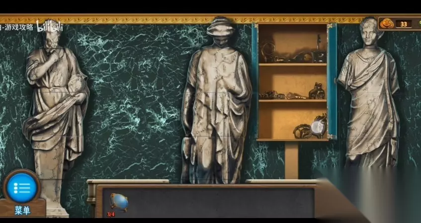 150、查看门左侧射箭的塑像,应用【锤头】获得塑像胳膊里的【锁匙】。 151、回到博物馆展厅,应用舌像胳膊里的【锁匙】开门左边的箱子,得到【旋钮2】和【头部2】。 152、回到办公室,应用衣服口袋里的【锁匙】开启资料柜,得到【电池】,再根据时代一天到晚顺序从上向下放置资料柜上边的视频,得到【旋钮3】。 153、将【电池】安装于【手电】中,随后赶到第3个屋子,点击左上方的通风孔,应用【手电】获得【头部3】。 154、将【头部】安装于右侧纱帘里的塑像上,进行拼图小游戏,得到【锁匙】。