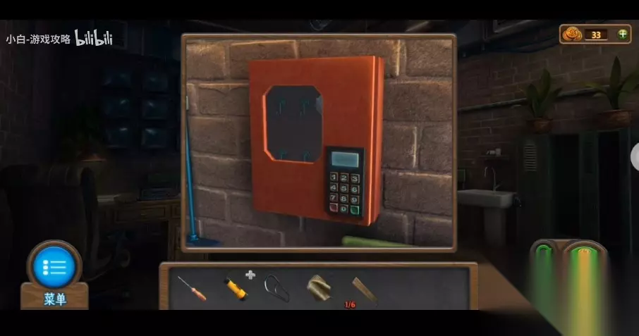 136、查看第1个衣柜的锁,应用螺丝刀铁夹进行游戏开锁,得到【摇杆】【钥匙卡】和【锤头】。 137、将【摇杆】安装于显示器闸刀上,拉掉闸刀,观查显示屏亮起来位置。 138、点击门锁对比显示屏输入密码,应用【钥匙卡】开门出来。