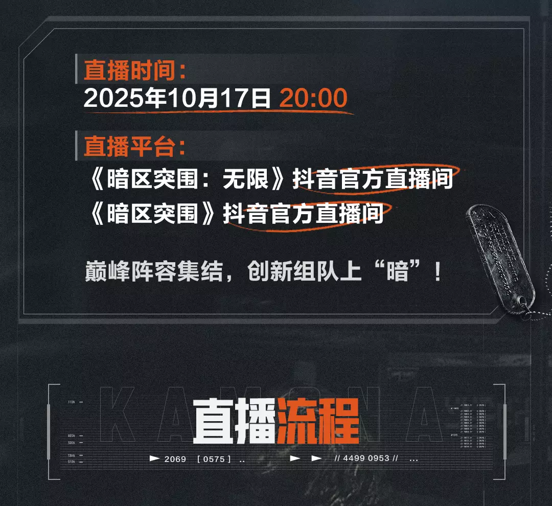 “卡莫纳全球迎新”直播来啦!10月17日20:00,锁定《暗区突围》和《暗区突围:无限》抖音官方直播间,知名学长重返暗区,与端手主播热血集结!